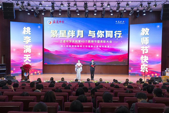 春風(fēng)化雨,潤(rùn)物無(wú)聲育桃李;秋意深深,佳節(jié)將至頌師恩。9月8日,昭通市正道中學(xué)舉行“繁星伴月·與你同行”第40個(gè)教師節(jié)暨表彰大會(huì)。董事長(zhǎng)王立舉、黨支部書記喬家東、執(zhí)行校長(zhǎng)陳煜輝、黨群負(fù)責(zé)人董自成、行政副校長(zhǎng)王亞麗、小學(xué)部校長(zhǎng)徐偉、初中部校長(zhǎng)趙蓉、高中部校長(zhǎng)饒政等相關(guān)領(lǐng)導(dǎo)和全體教職員工參加表彰大會(huì),共同慶祝教師節(jié)。工會(huì)主席彭舒夢(mèng)、陳濼老師主持活動(dòng)。